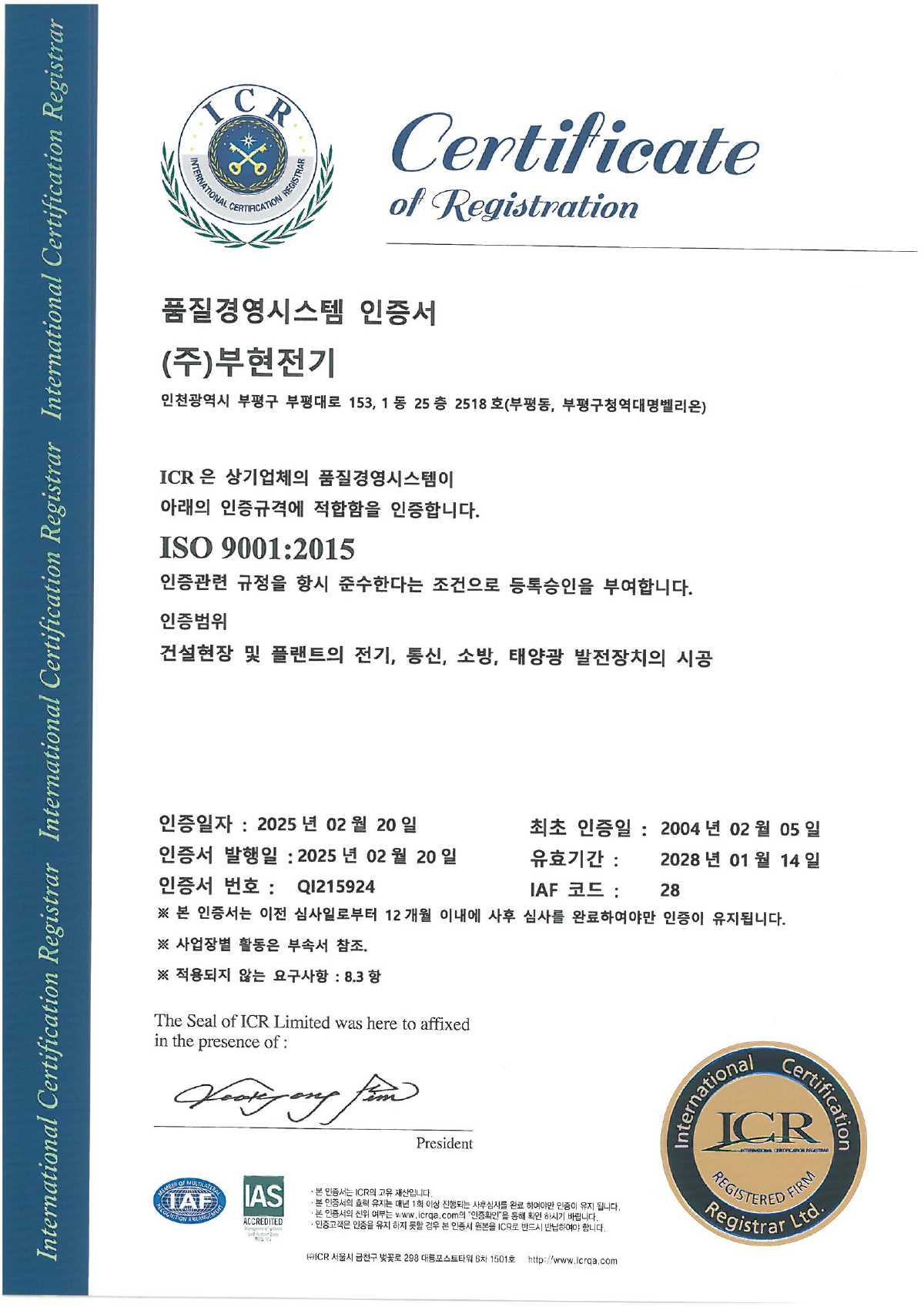 품질경영시스템 인증서