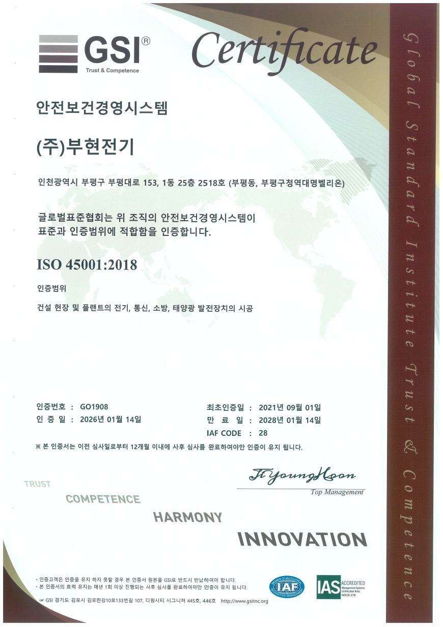 철저한 안전교육, 무사고 달성기업으로 신뢰받는 부현전기가 관리합니다.